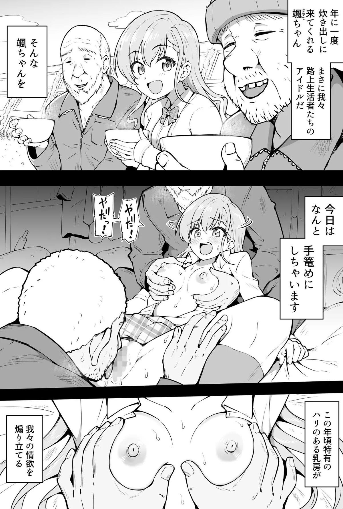 炊き出しにきた颯が路上生活者達に凌辱されてしまう…